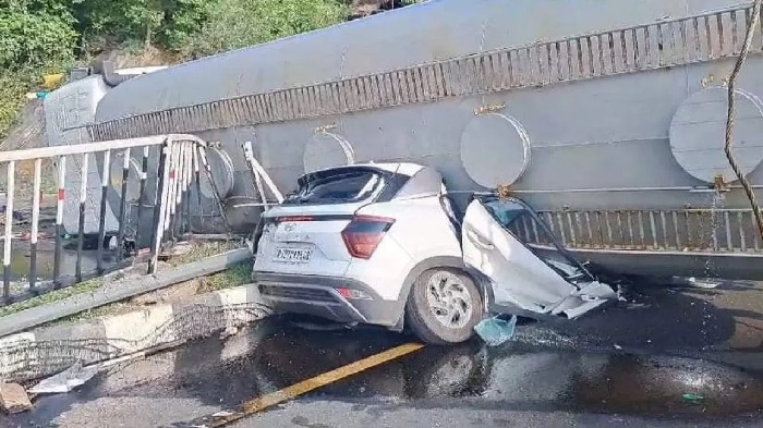 आपस में भिड़े बड़े वाहन… कार पर उछलकर गिरा पेट्रोल कंटेनर, 4 सदस्यों की मौत
