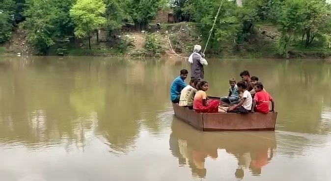स्कूल जाने के लिए टूटी नाव में नदी पार कर रहे बच्चे, पुल बना लेकिन रास्ता नहीं