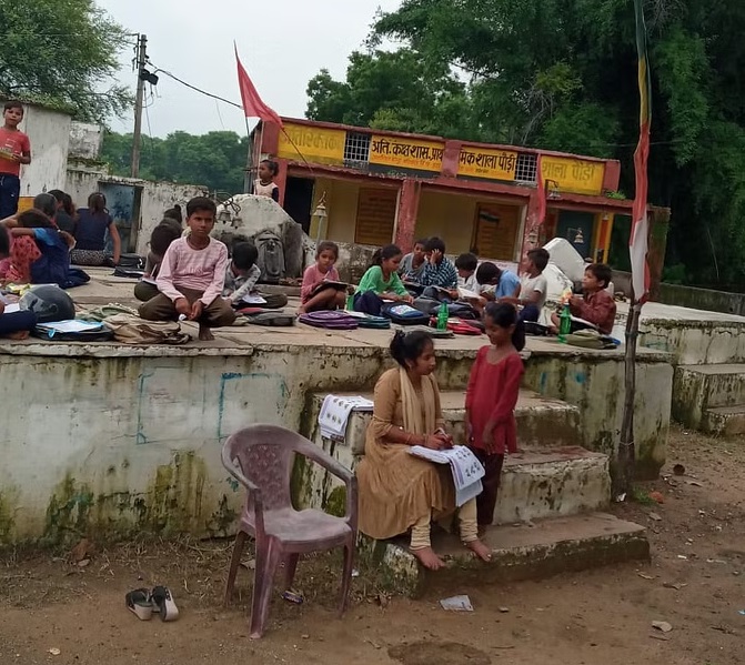 MP: स्कूल के अंदर मृत पड़ी गाय, शिक्षक और छात्र बदबू से परेशान; चबूतरे पर लगा स्कूल